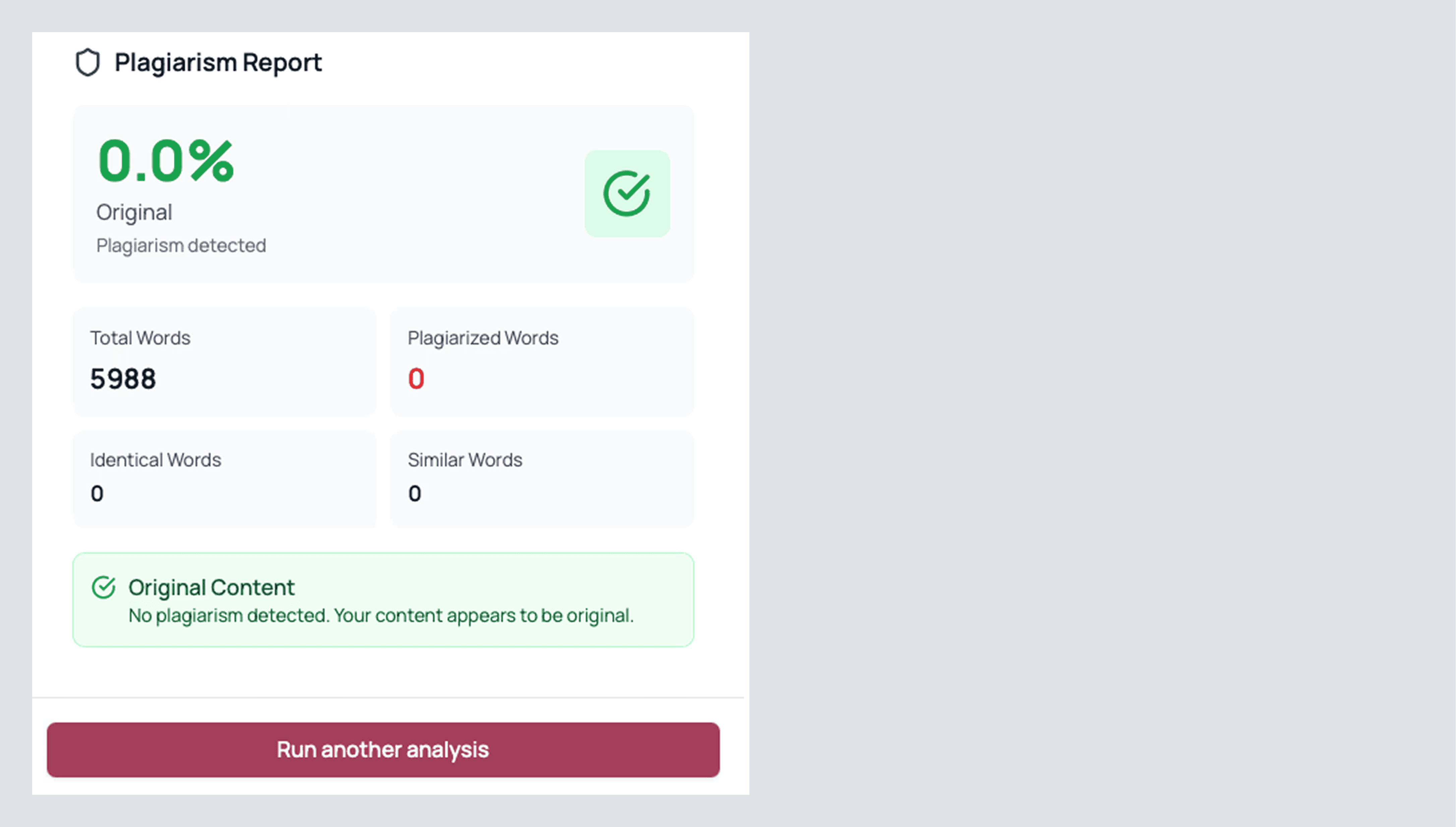 In my example, the document returned 0% detected plagiarism, making it safe to use as-is.