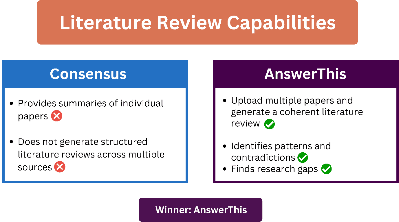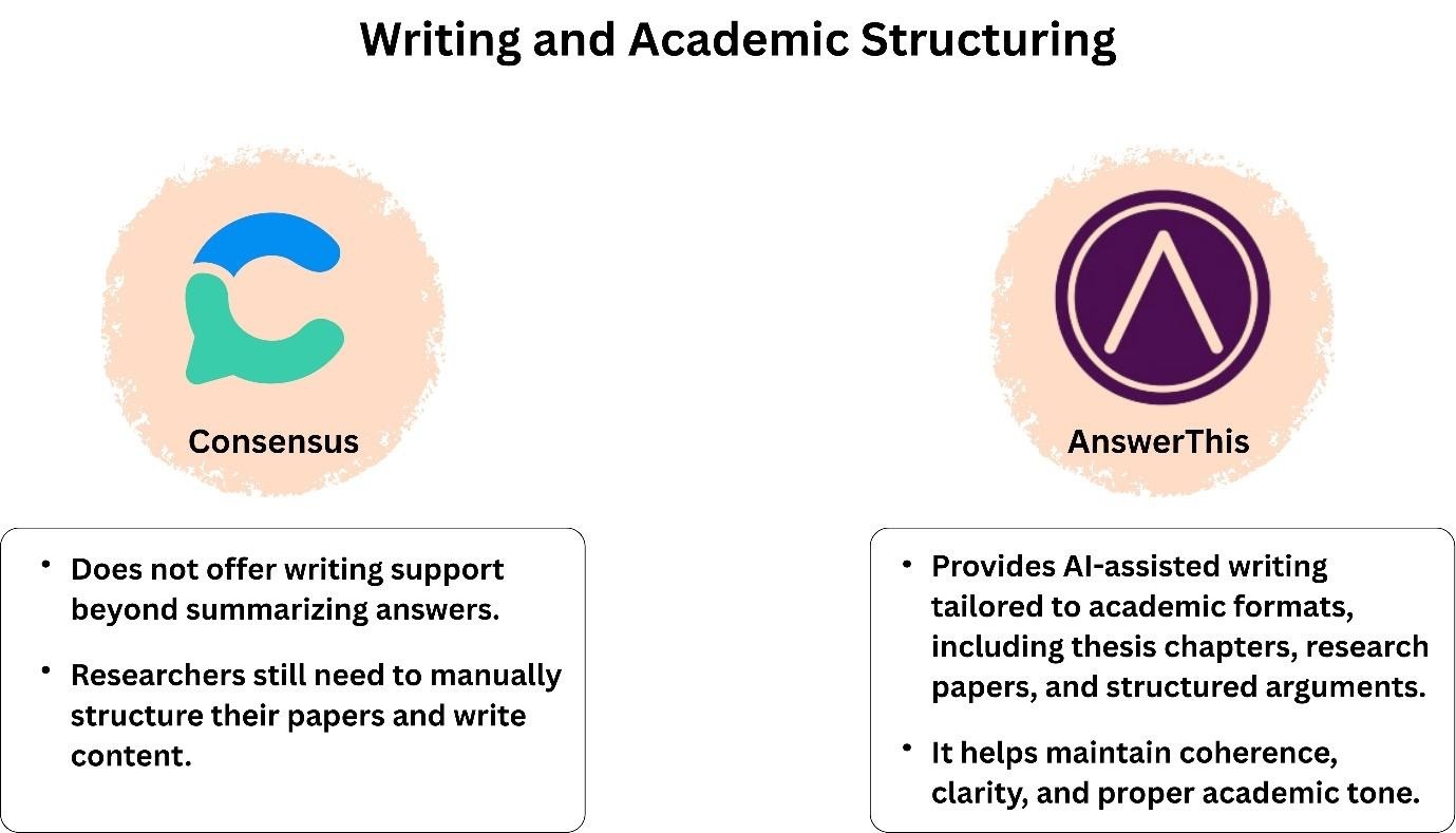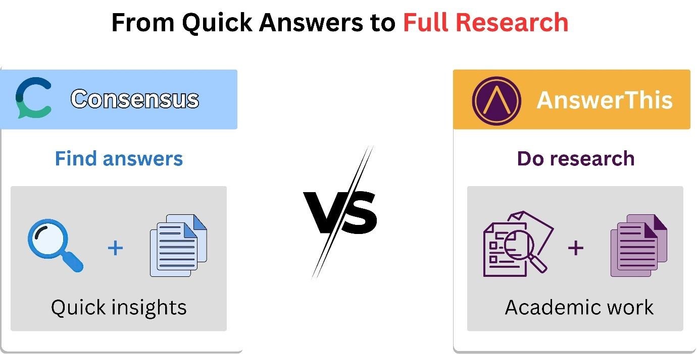 Consensus provides rapid and verifiable responses but has a limited application area (won't support complete research). AnswerThis provides a comprehensive AI-driven research environment which allows finding, processing, and producing high-quality academic materials.