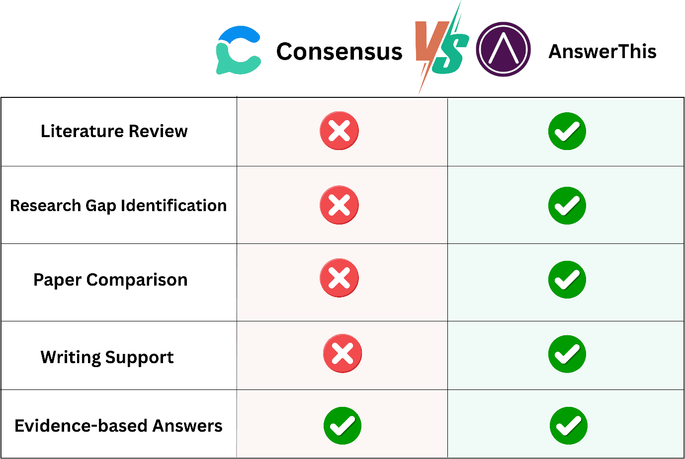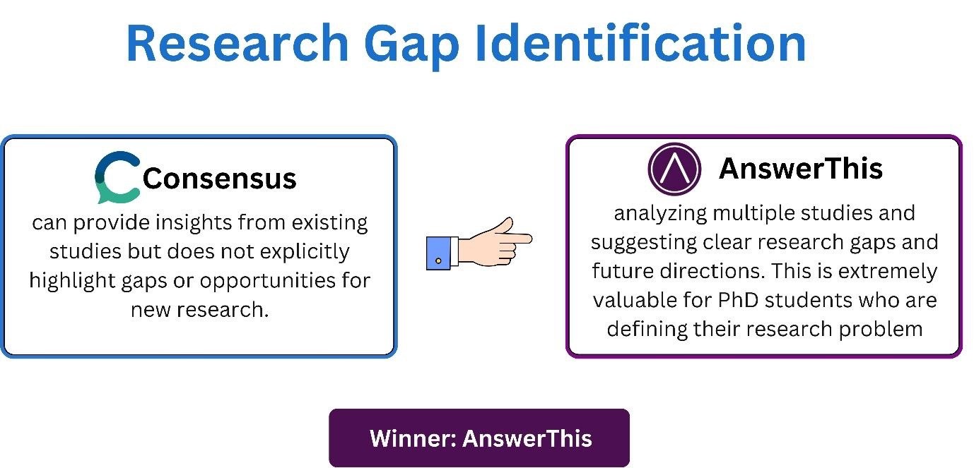 There is a key difference between AnswerThis and Consensus based on how they are used. The goal of Consensus is to provide you with an answer, while the goal of AnswerThis is to help you do your research. Consensus can be used for providing fast insights, but once you have gone past the initial exploratory stage (i.e. to create a literature review, to create a synthesis of multiple papers), the usefulness of Consensus diminishes. On the other hand, AnswerThis is a tool used to enable researchers to go beyond just reading papers and create publishable output.