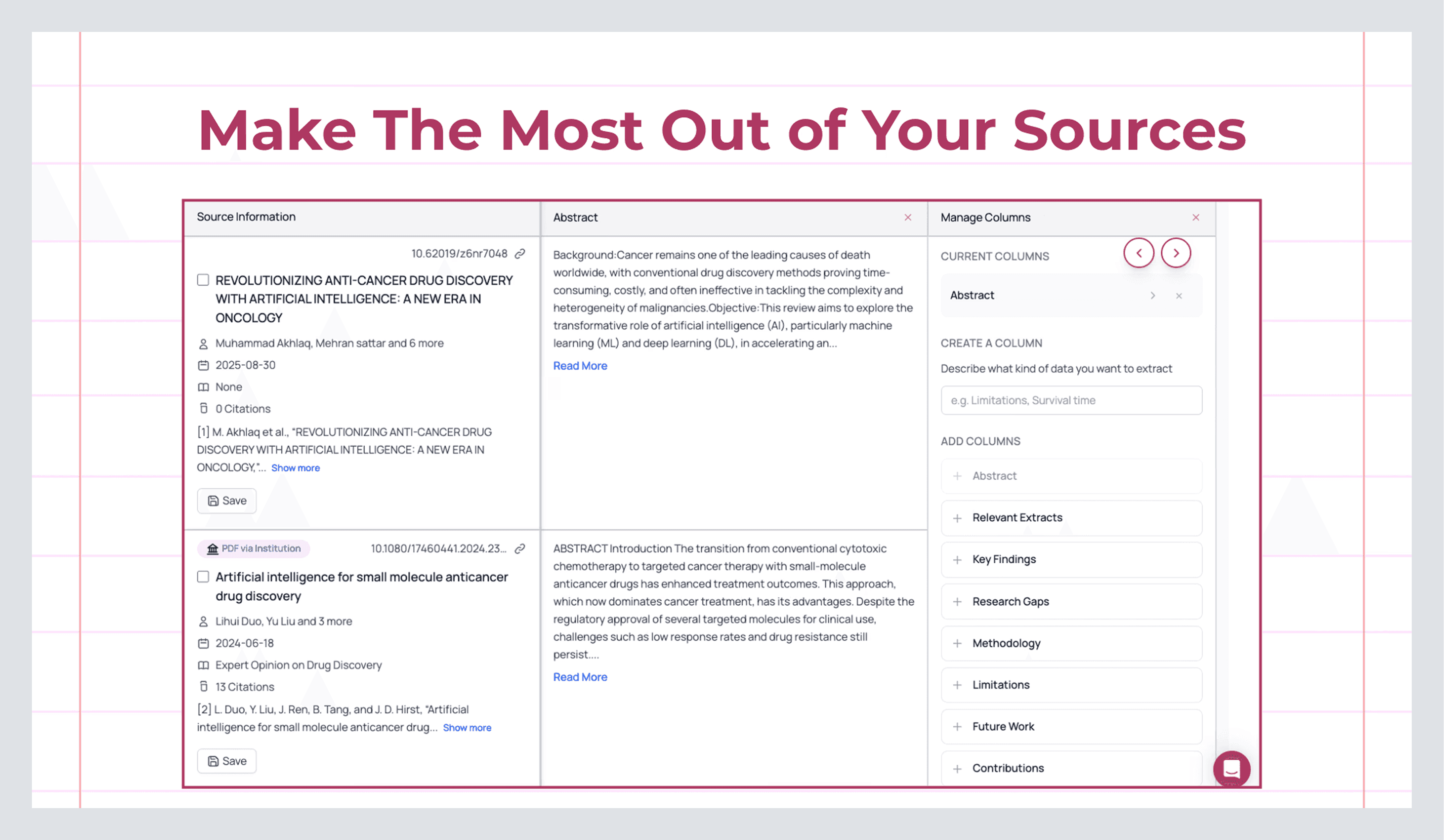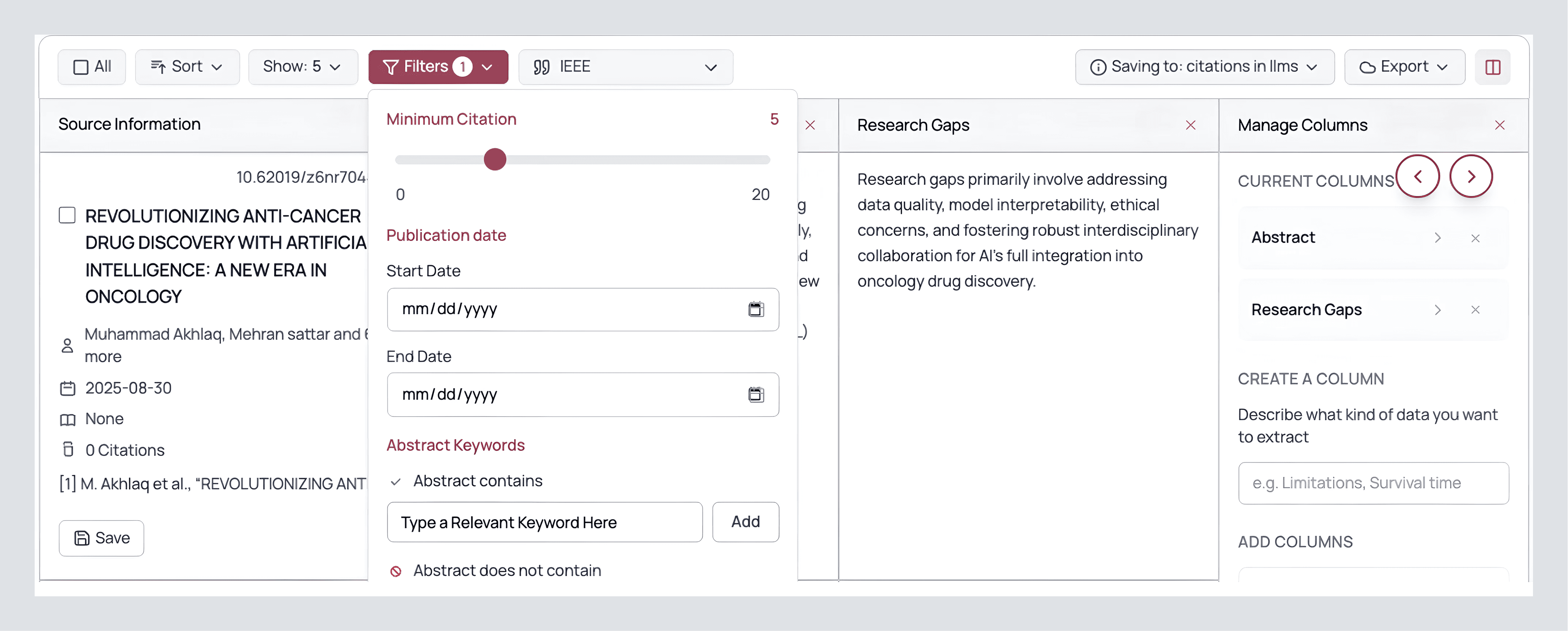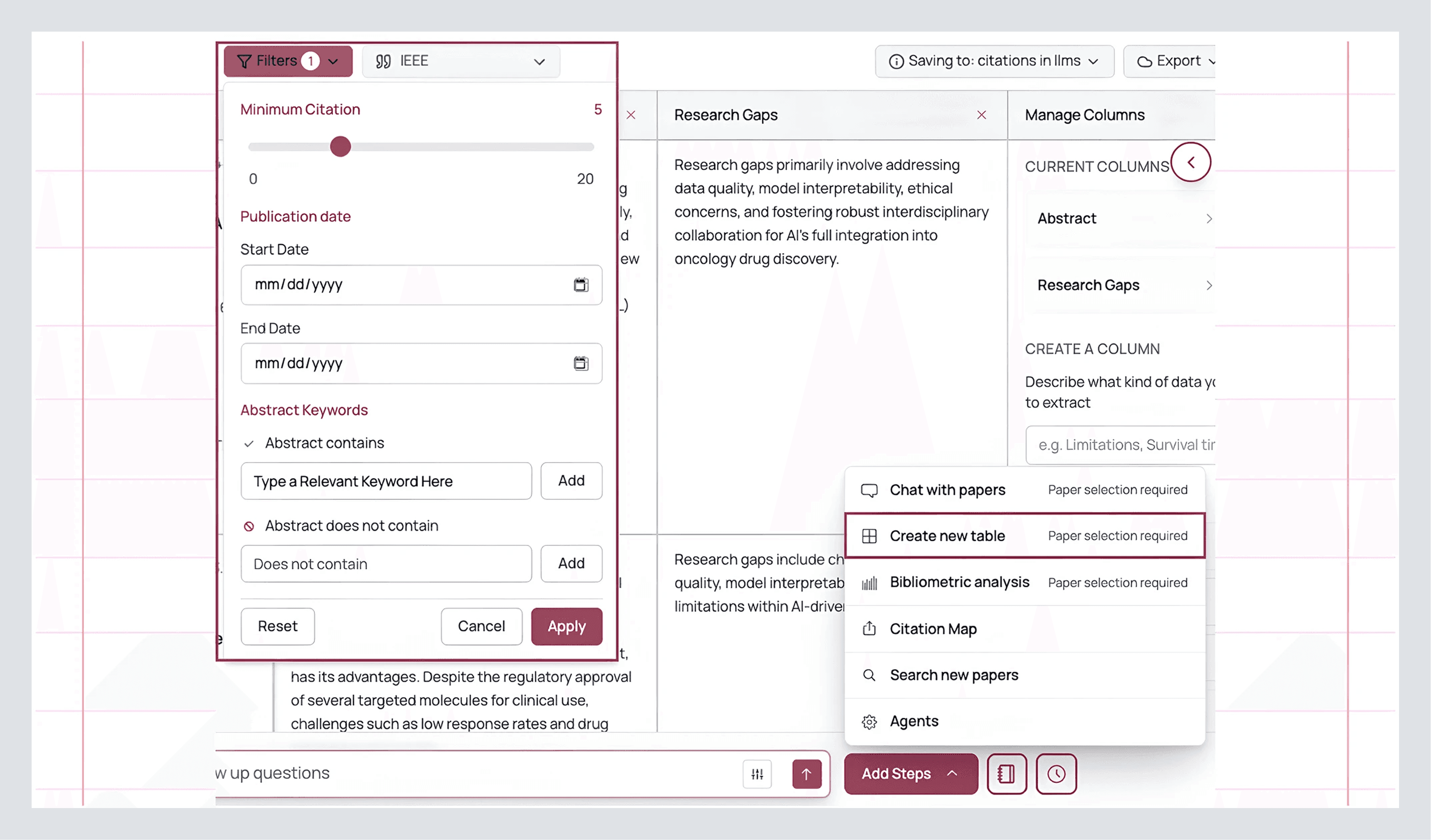 Inside a library, work like a researcher, not an archivist. Click Manage Columns and extract the data you’ll keep having to answer for: Methods, Metrics, Gaps, Limitations, Inclusion/Exclusion criteria, Sample sizes, and any custom pull you want to standardize. Those extractions persist inside the library, which means you do the careful reading once and then reuse the structured view across your draft, a grant, a talk, and the follow-up review you’ll run next month.