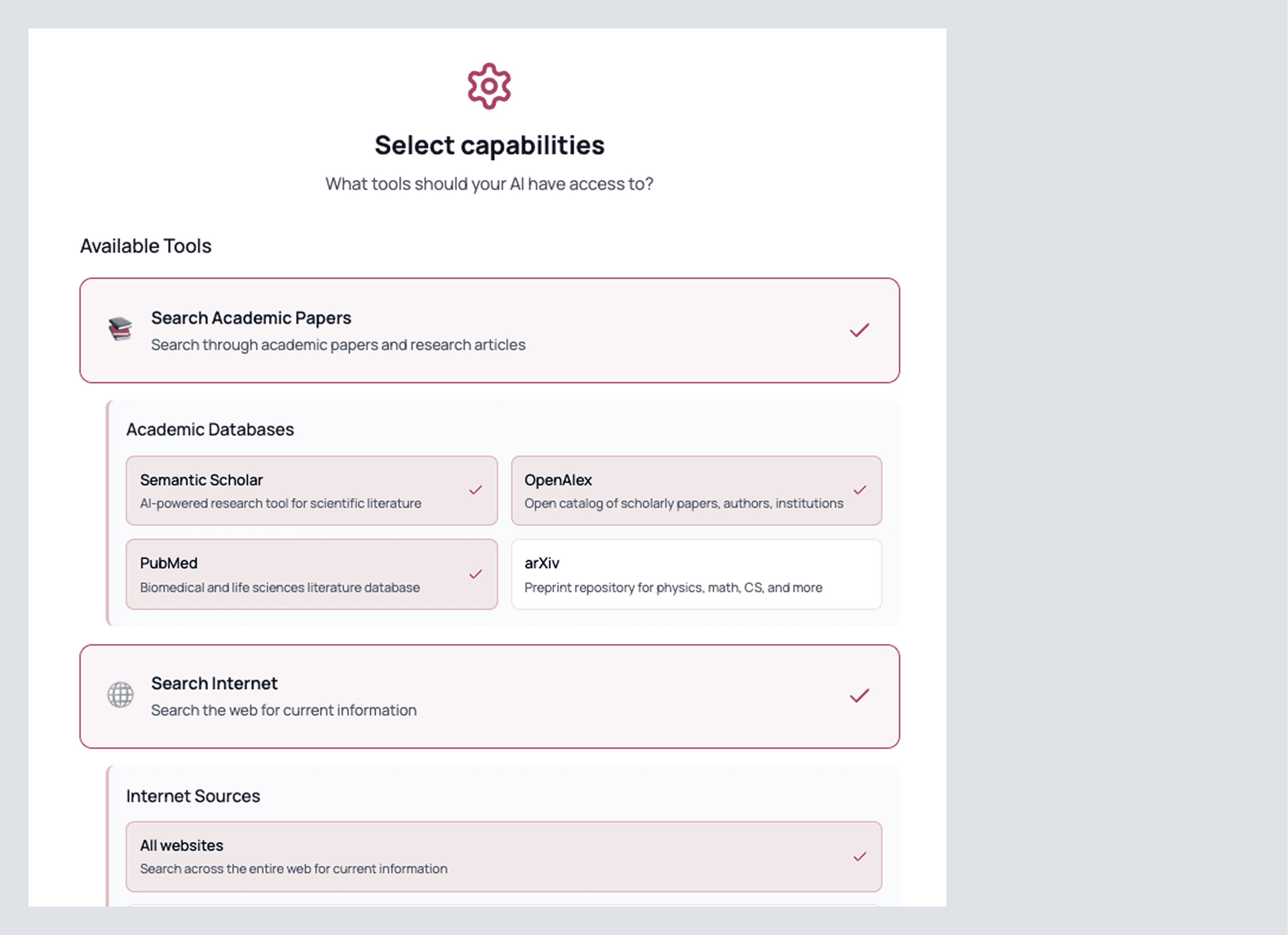 Define what it’s allowed to look at. Pick your academic databases (OpenAlex, Semantic Scholar, PubMed, arXiv) and whether the web is in-bounds (you can scope to .edu or .gov only if that’s your bar). If the tool should operate on your own corpus, upload PDFs, or connect a Library so it stays inside your set.