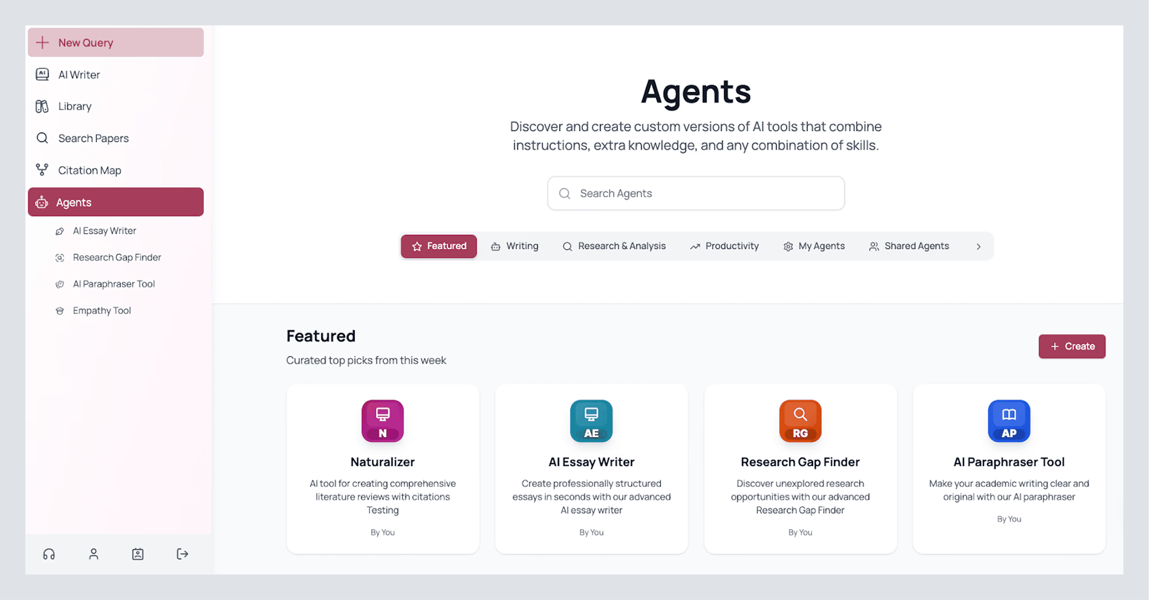 Click Tools on the left. You’ll land in a gallery of mini agents that you can use: a search bar at the top if you know what you want, and tags to browse by need (e.g., Productivity, Analysis). The Featured shelf is where AnswerThis surfaces high-impact helpers. Two worth opening first: