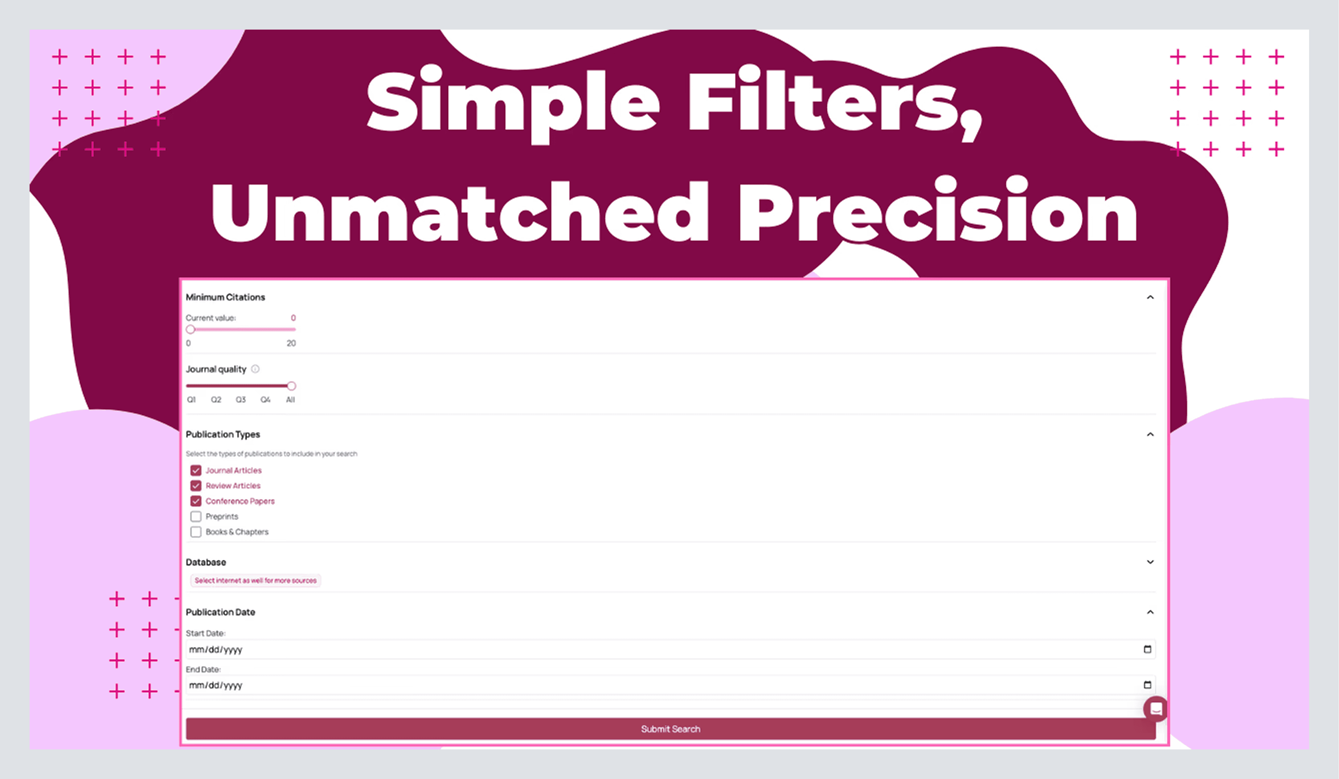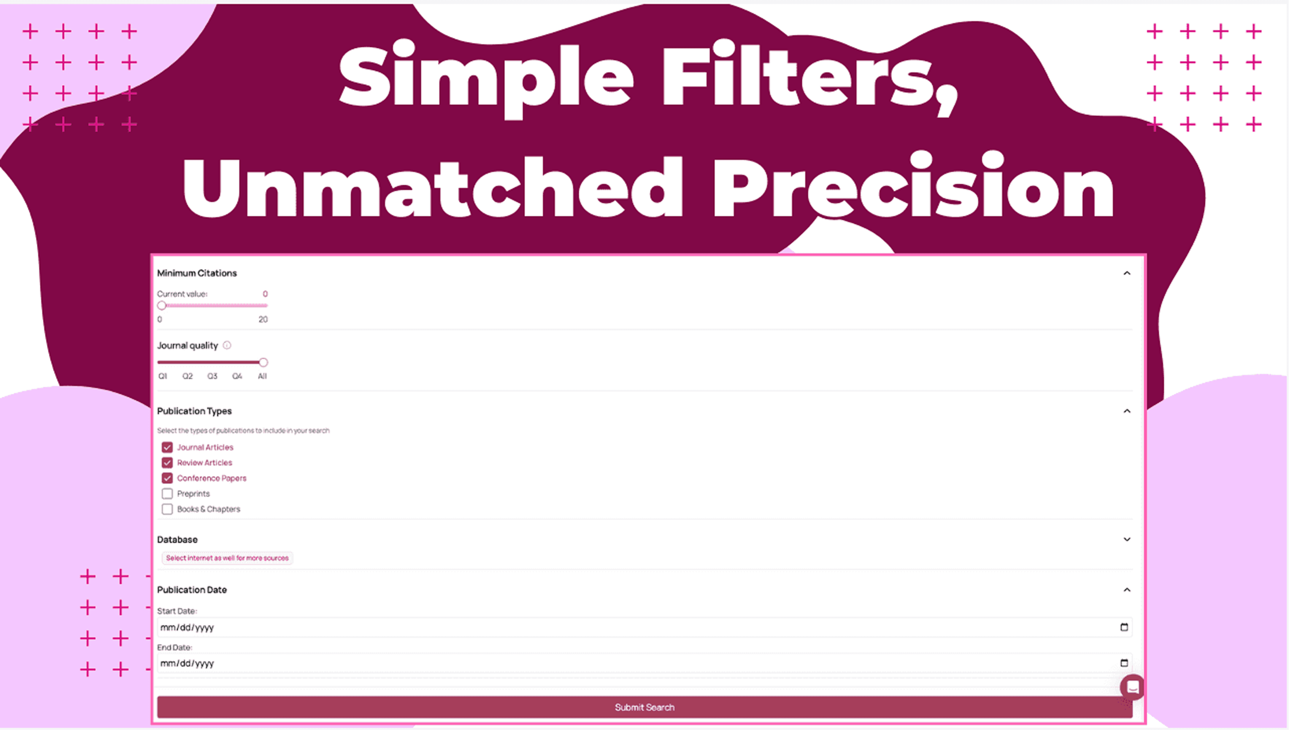 Use the input like you would a precise prompt or enter keywords for the research papers/sources that you are looking for. Then open More Filters to narrow down to the exact type of paper you need. Here are some options you can set: