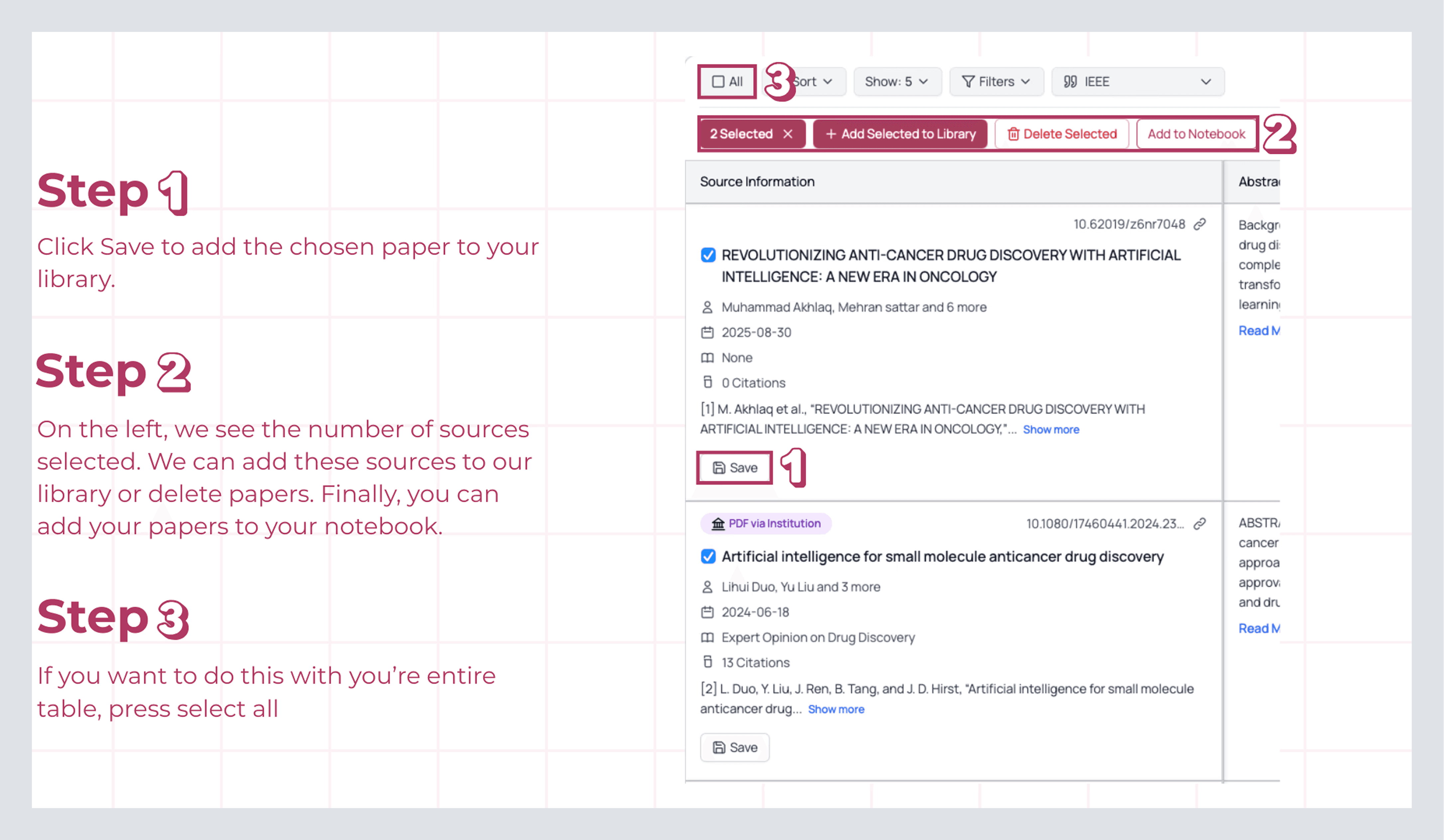 If we want to take it one step further, we can select all papers at once using the checkbox in the top left corner. Whether we select all or just a few, we’ll still see the four options mentioned earlier, plus the Next Step button, which lets us view more information about the sources and connect them together.