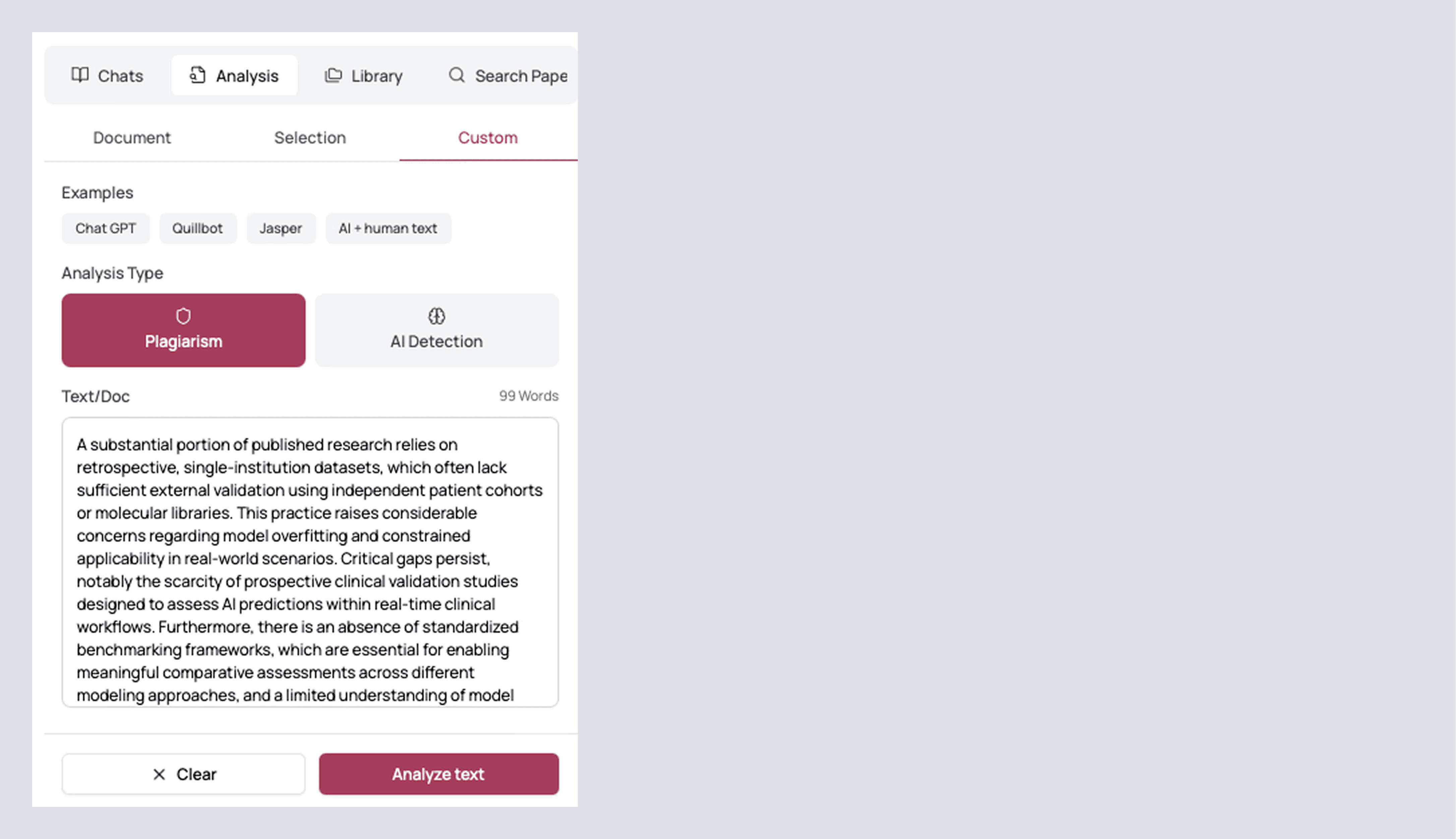 If this wasn’t enough, you can click on Custom (the top right option). This will allow you to copy and paste text with GPT, QuillBot, and other AI examples of writing so that you can avoid AI detection amongst several models. You can also detect plagiarism here to