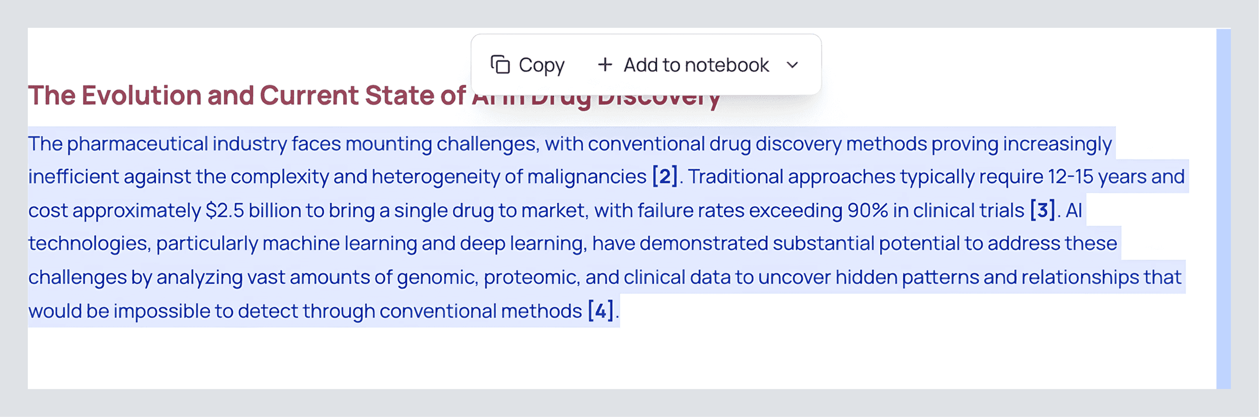 First, save text from your literature review. When a paragraph explains a concept you’ll reuse, highlight it and click Add to Notebook. What lands in the left pane isn’t a dumb paste; it comes with the source (title, authors, year, DOI) attached, so you can always jump back to the exact paper row.