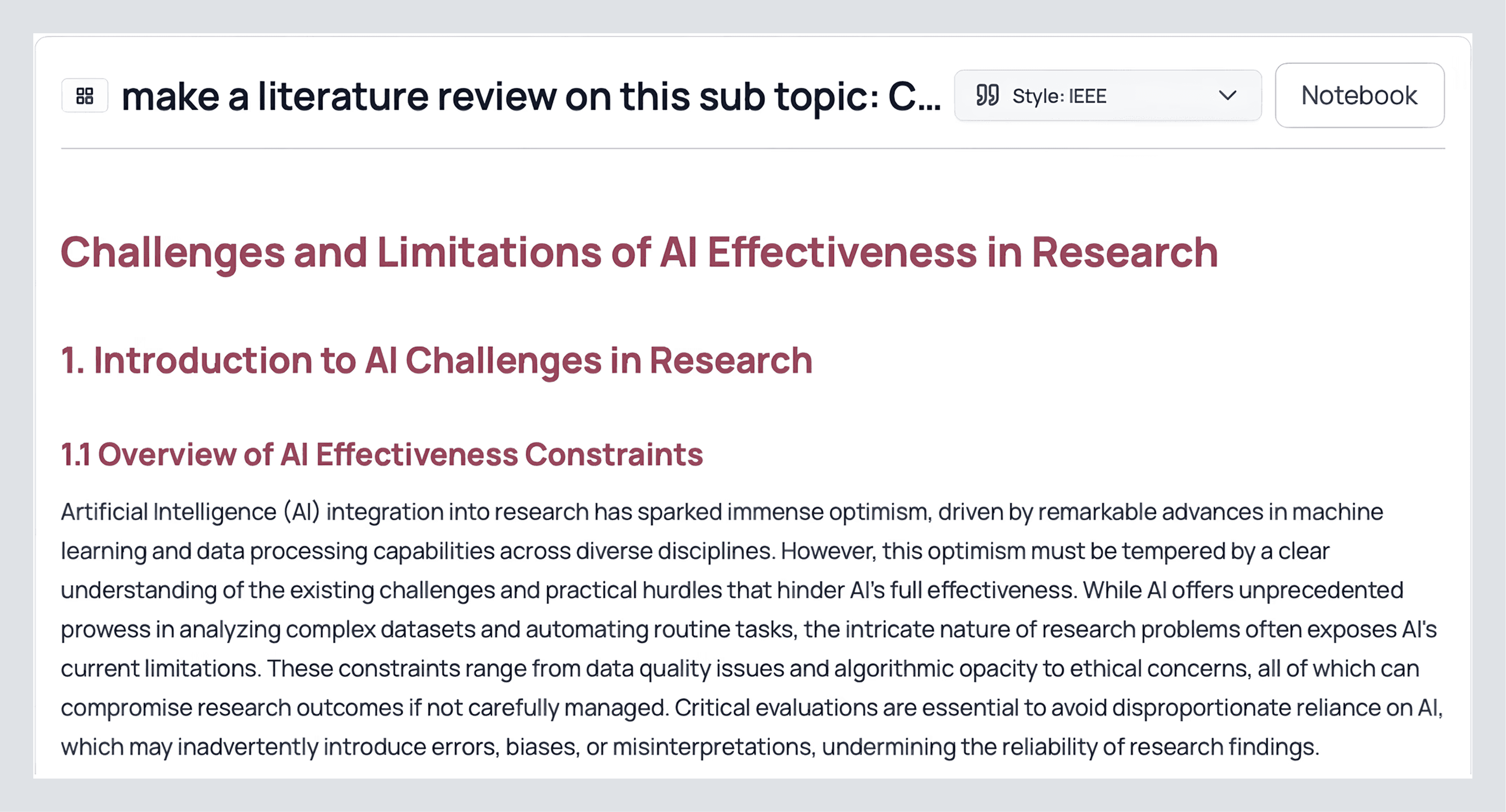 When a subsection deserves its own literature review or you have a research question based on something you saw, simply click and write a prompt in the box below.