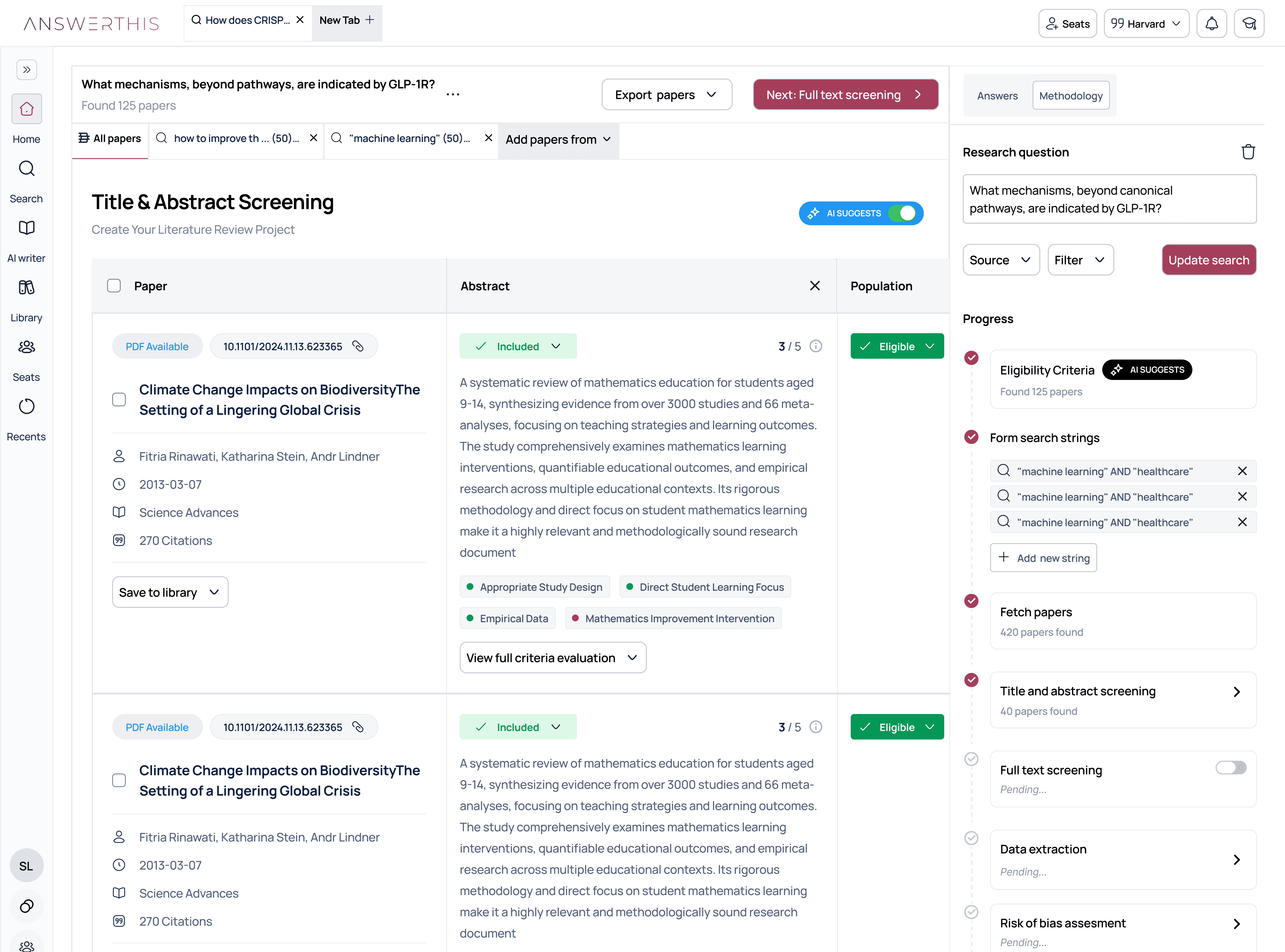 Title, abstract, and full-text screening at machine speed with human-in-the-loop override.