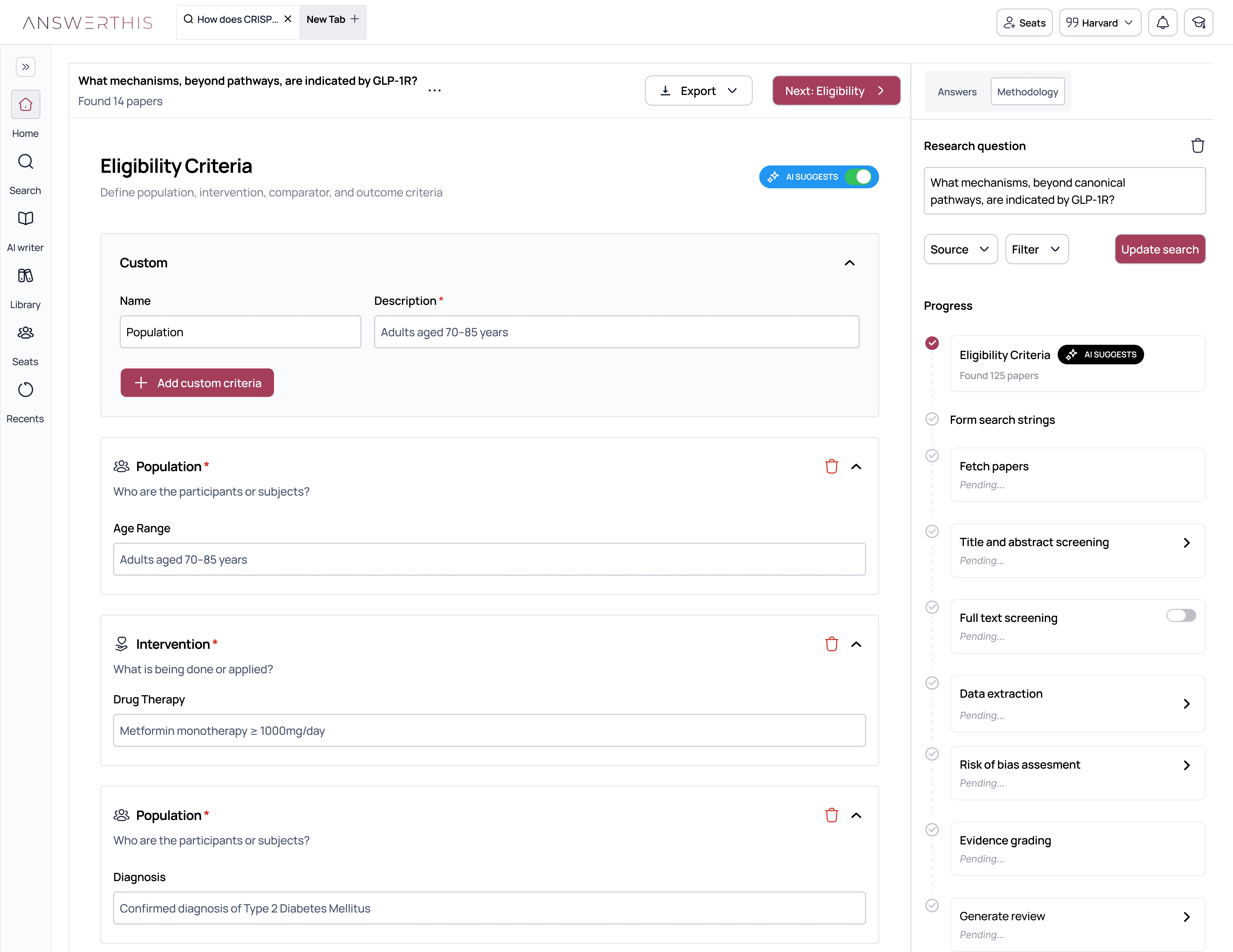 Auto-generated inclusion/exclusion criteria and Boolean search strings across 10+ databases.