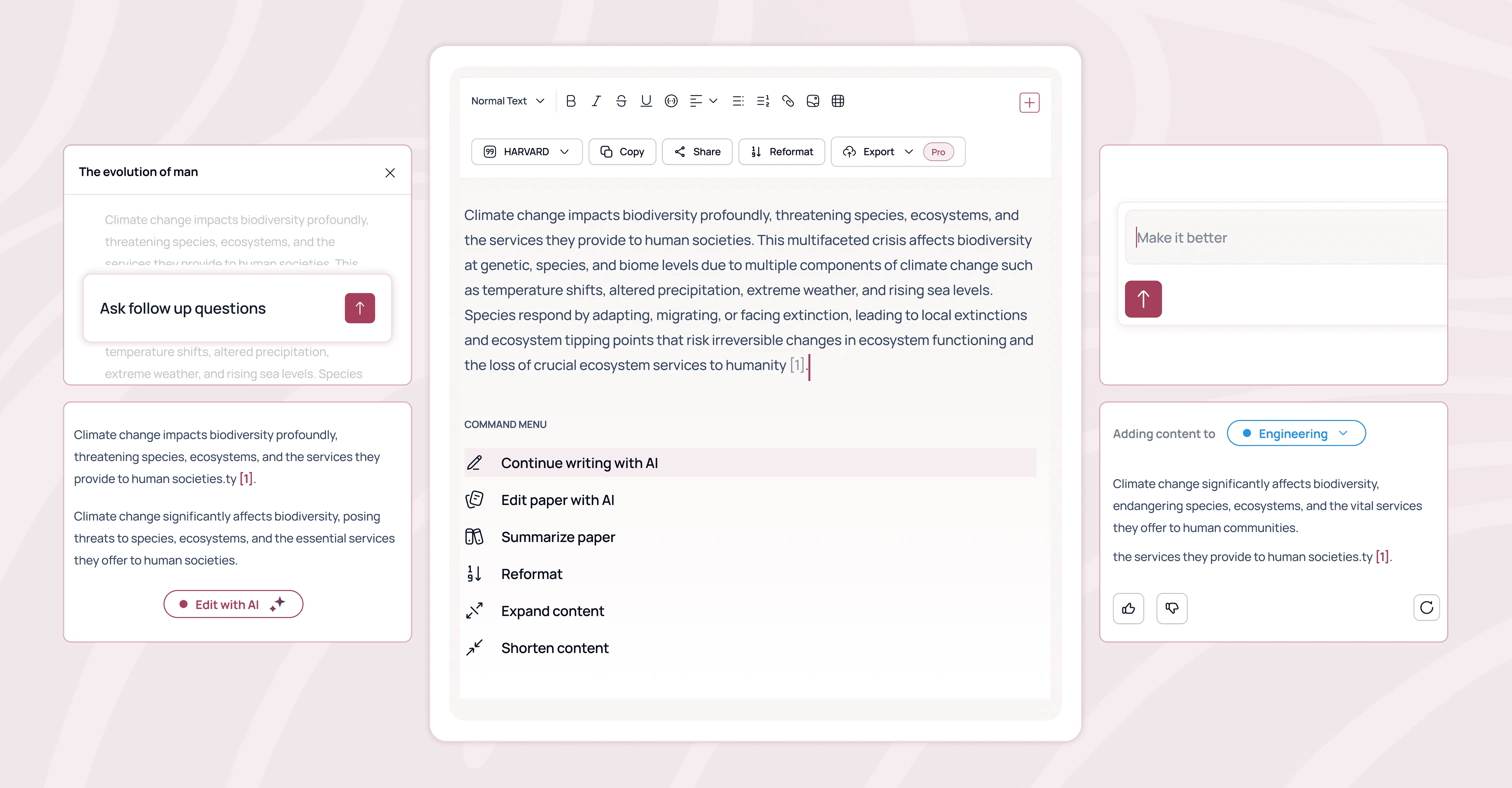 Fill gaps in your writing with citation backed content, share work and use the plagiarism tool to polish writing.